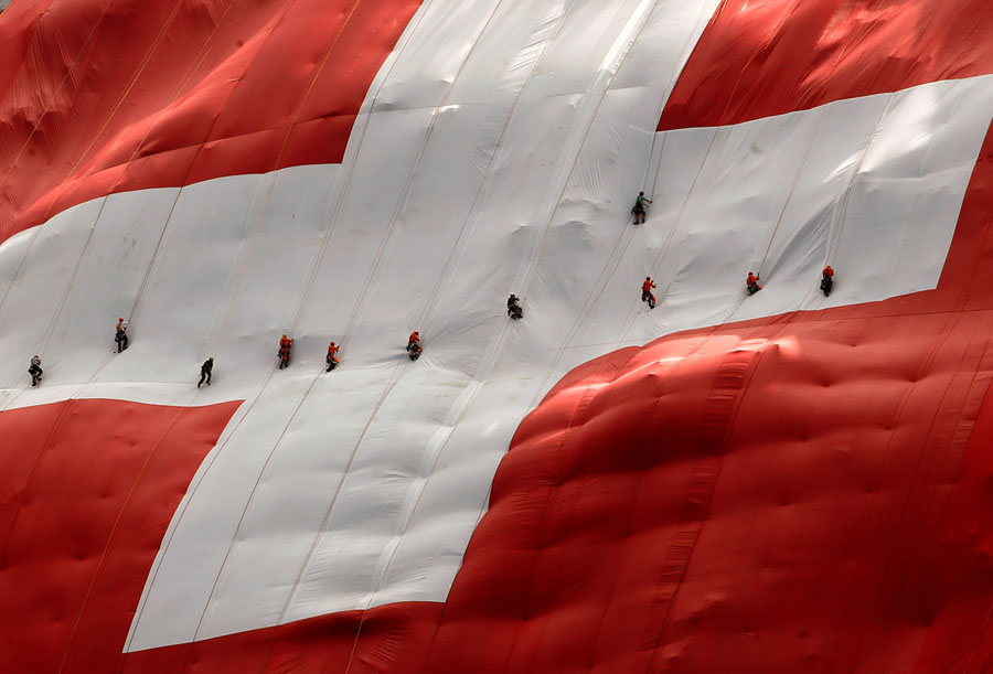 Read moreClimbers maneuver on a huge 80x80 meter (262x262 foot) Swiss national flag after fixing it on the western face of the landmark Mount Saentis in Switzerland on July 31, 2018. #