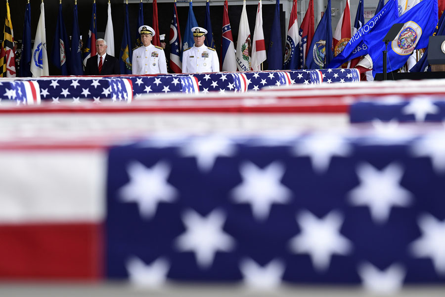 Read moreVice President Mike Pence, Commander of U.S. Indo-Pacific Command Adm. Phil Davidson (center) and Rear Adm. Jon Kreitz, deputy director of the POW/MIA Accounting Agency, look at transfer cases at a ceremony marking the arrival of the remains believed to be of American service members who fell in the Korean War at Joint Base Pearl Harbor-Hickam, Hawaii, on August 1, 2018. North Korea handed over the remains last week. #