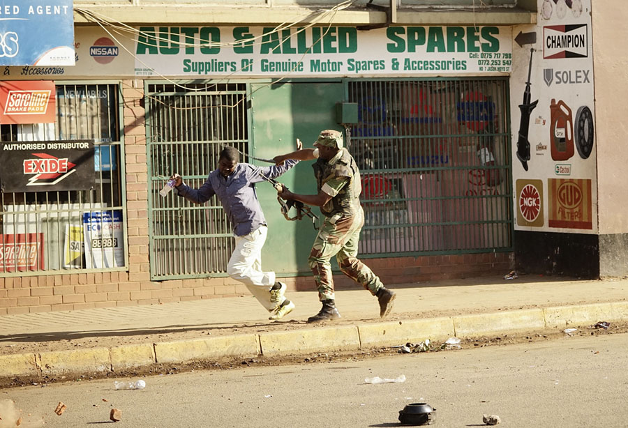 Read moreA Zimbabwean soldier beats a man in a street of Harare on August 1, 2018 as protests erupted over alleged fraud in the country's election. One man was shot dead, AFP witnessed, after the Zimbabwean army opened fire in central Harare on Wednesday as protests erupted over alleged fraud in the country's election. President Emmerson Mnangagwa on August 1 called for peace as police fired water cannon and teargas at opposition supporters in Harare over alleged fraud in Zimbabwe's elections. #