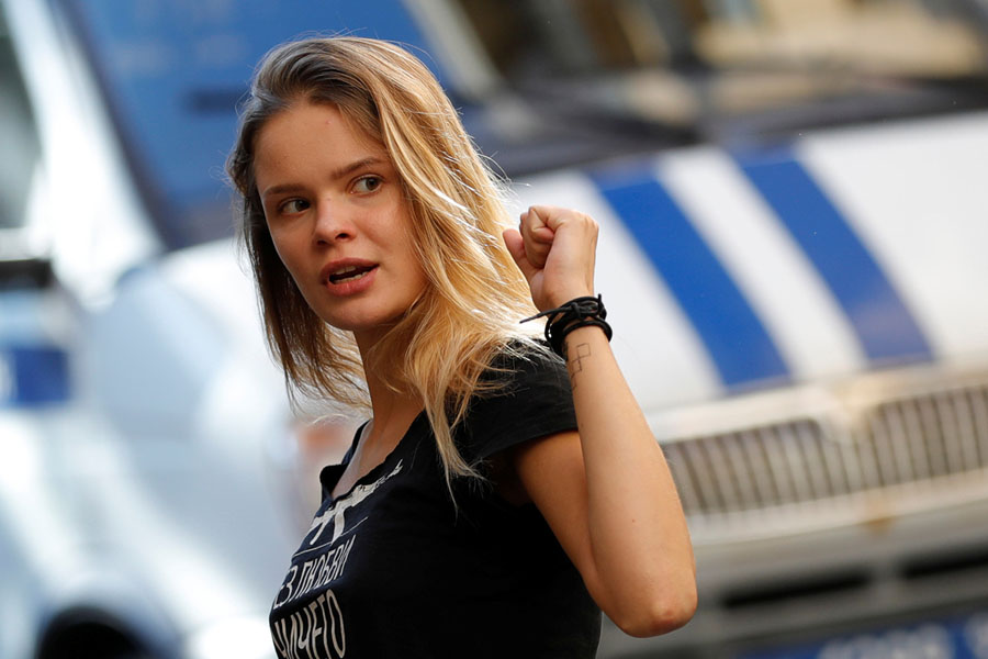 Read moreVeronika Nikulshina, one of four members of Russia's Pussy Riot protest group who were jailed for 15 days for staging a pitch invasion during the football World Cup final and were detained again after their release on July 30, gestures outside a court building in Moscow, Russia, on July 31, 2018. #