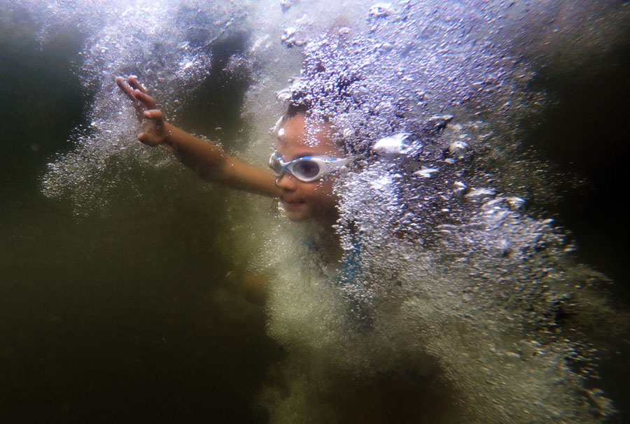 Read moreEva Furman, 8, surfaces through a wall of bubbles after jumping from a small cliff into Lake Wood at Acadia National Park, on July 30, 2018, near Bar Harbor, Maine. Furman, of Boca Raton, Florida, was spending the warm summer day cooling off at a popular swimming hole while on a family vacation. #