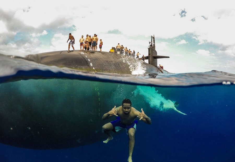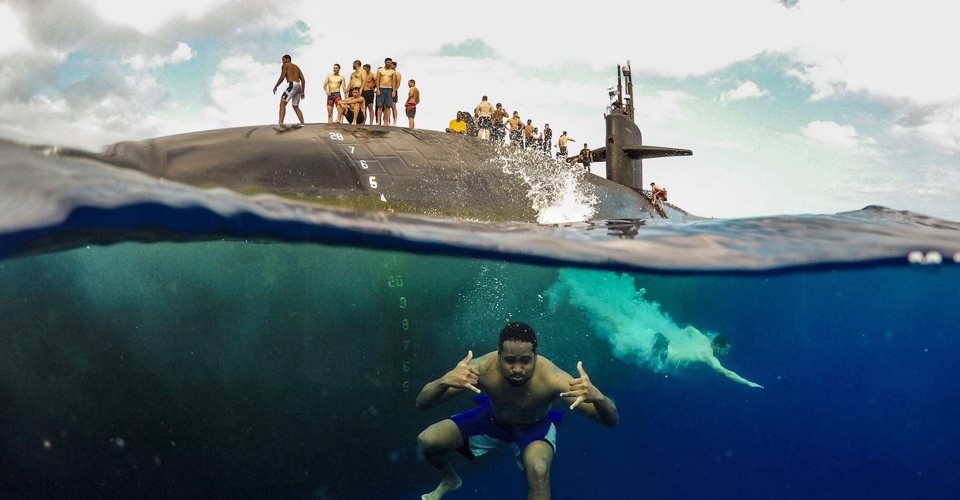 Read more"Steel Beach." Sailors dive into the Pacific Ocean, somewhere near Hawaii, on August 2 during a swim call aboard the Los Angeles–class submarine USS Olympia, after the week-long RIMPAC naval-warfare exercise had just ended. #