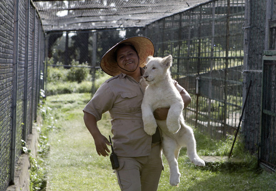 Read moreThe veterinarian Rodrigo Gutierrez Zecua carries one of a pair of four-month-old white-lion cubs as he prepares to move them from the cage where they spend the night to the enclosure where they are visible to the public during visiting hours at the Altiplano Zoo in Tlaxcala, Mexico, on August 7, 2018. #