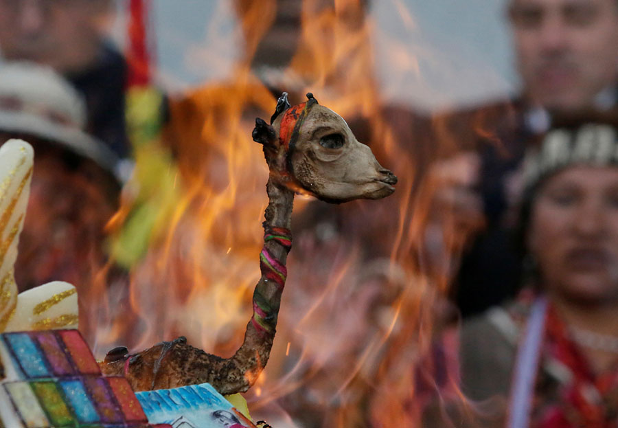 Read moreA llama fetus burns as part of an offering during the inauguration of the new Bolivian presidential palace, named La Casa Grande del Pueblo, in La Paz, Bolivia, on August 9, 2018. #