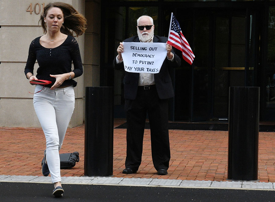 Read moreAfter a guilty verdict on the first count, an unidentified man holds a sign while Natasha Bertrand, a staff writer for The Atlantic, runs out of a U.S. district courthouse in Alexandria, Virginia, on August 21, 2018, the fourth day of jury deliberations in the former Trump campaign manager Paul Manafort's trial on bank and tax fraud charges stemming from Special Counsel Robert Mueller's investigation of Russia's role in the 2016 U.S. presidential election. #
