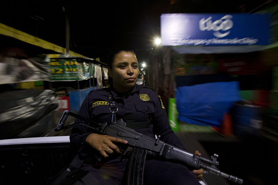 Read moreThe police officer Joselyn Mejia, 27, rides in the back of a pickup during a nighttime police patrol through a market street in central San Salvador, El Salvador, on August 20, 2018. #