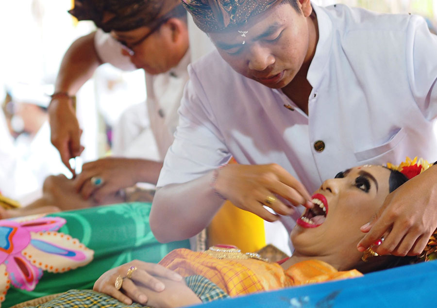 Read moreA religious leader, or mangku, files down a young woman's teeth during the Metatah tooth-filing ceremony in the village of Tegal Darmasaba, Badung Regency, Bali, Indonesia, on August 10, 2018. Young people from villages in southern Bali, dressed in gold-colored outfits, attend this coming-of-age tradition, where the sharper parts of their canines and incisors are smoothed as a way to show their shift into adulthood and their dedication to fight human evils such as desire, anger, and greed. #
