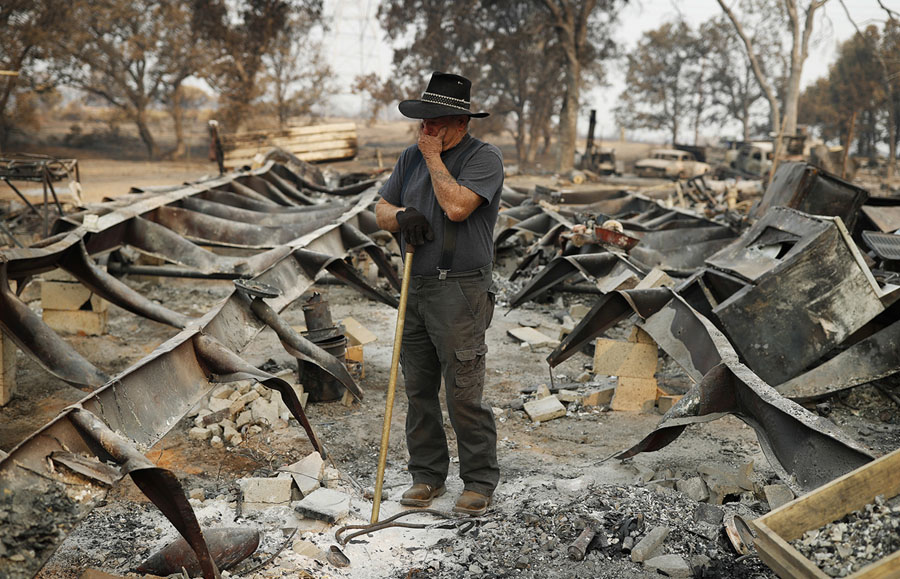 Read moreEd Bledsoe tries to hold back tears as he searches through what remains of his home on August 13, 2018, in Redding, California. Bledsoe's wife, Melody, his great-grandson James Roberts and his great-granddaughter Emily Roberts were killed at the home in the Carr Fire. Read Bledsoe's full story here. #