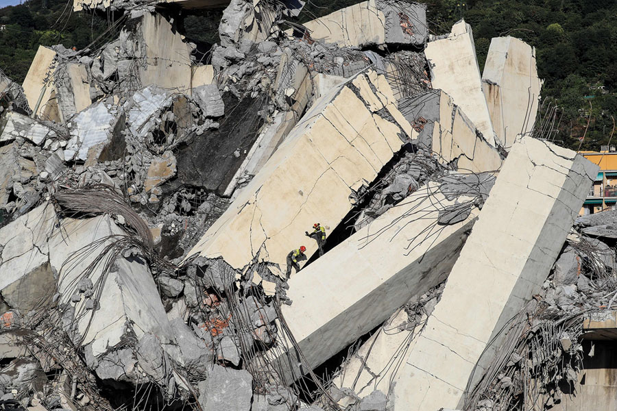 Read moreItalian rescuers climb onto the rubble of the collapsed Morandi motorway bridge searching for victims and survivors in the northern port city of Genoa on August 14, 2018. At least 39 people were killed when the giant bridge collapsed in the deadliest bridge failure in Italy in many years. #
