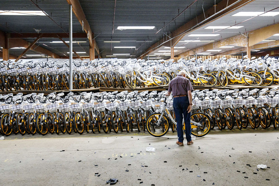 Read moreA man inspects a brand new bicycle, left over from the oBike bike-sharing business, that was being sold at a warehouse where thousands of the bicycles are stored on August 14, 2018, in Hamburg, Germany. The Singapore-based oBike filed for bankruptcy in July, leaving behind 10,000 bicycles in Hamburg alone. A local businessman bought a portion of the bicycles and is selling them for $79, or 69 euros, each. While oBike bicycles have been collected in some cities, in others, such as Munich, they remain abandoned on the streets, much to the irritation of city authorities. #