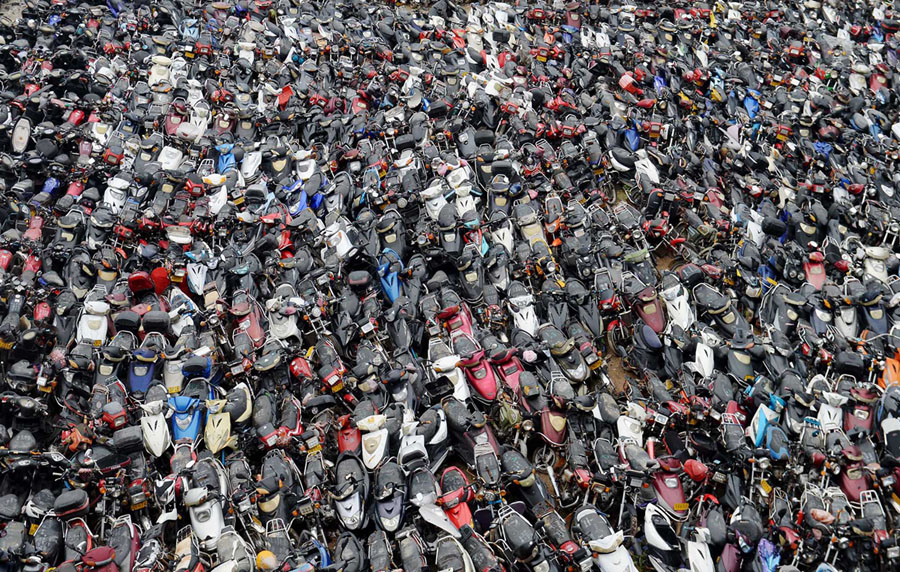 Read moreIllegal motorcycles seized by police sit stacked in a scrap yard in Guangzhou, China, on August 10, 2018. There were over 6,000 illegal motorcycles seized by local police over the past year in the yard. #