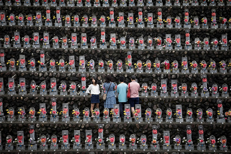 Read moreIn this picture taken on August 13, 2018, a family pays respects in front of jizo statues in the Jizoji Buddhist Temple in Oganomachi, Japan, for the souls of unborn children and those who died at a young age, during the Obon prayers period. The Jizoji temple in Ogano, northwest of Tokyo, enshrines some 15,000 jizo stone statues. Hundreds of the temple's followers and those who have donated the stone statues gather for the Obon prayer on August 13, one of the days when the souls of the dead are believed to return to the world under the Buddhist teaching. #