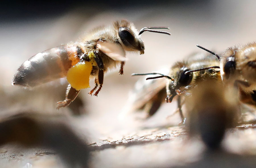 Read moreA honey bee carrying pollen lands next to the entrance of a beehive at the apiary of the beekeeper Anna Lobyntseva, 66, in the village of Radkovka, Russia, on August 12, 2018. #
