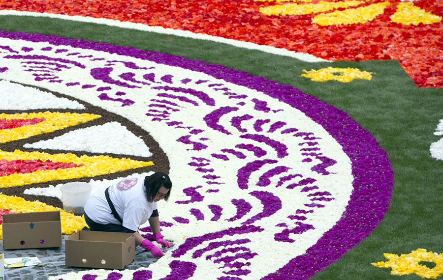 Read moreA volunteer lays out a section of the Brussels flower carpet on the Grand Place in Brussels on August 16, 2018. More than 500,000 flowers were used to create the Latin American theme, devoted to the Mexican region of Guanajuato, which has an exceptionally rich culture and flower tradition. #