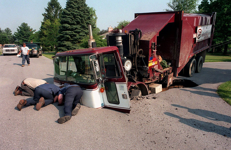 Read moreWorkers from Dave's Truck Repair try to figure out how to tow a waste-disposal truck out of a sinkhole after a road collapsed in North Guilford Hills, near Chambersburg, Pennsylvania, on June 20, 1997. The truck was on its regular route when the road gave way, startling area neighbors. The driver and a passenger were not injured. #