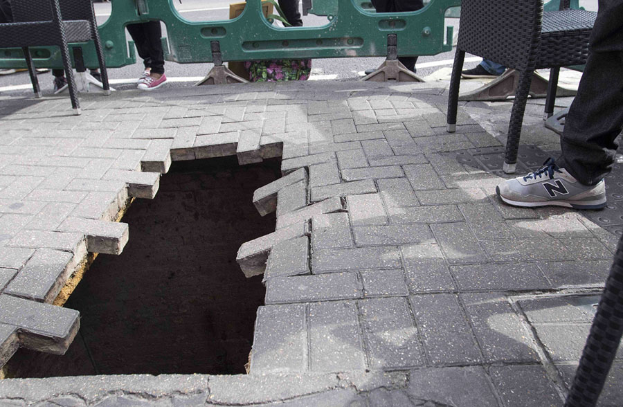 Read moreA collapsed paved sidewalk, photographed on North End Road in London on April 23, 2015. A woman allegedly fell down the hole when a the pavement gave way without warning. #