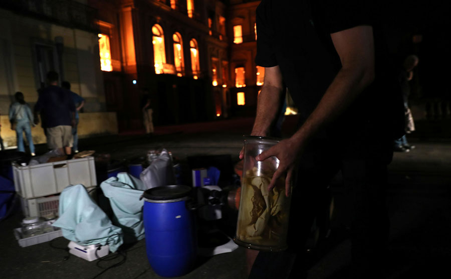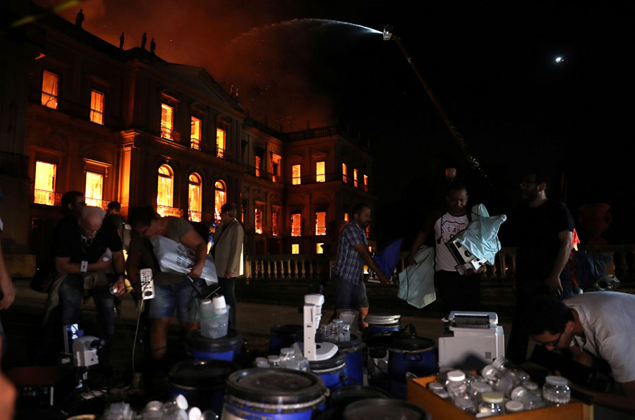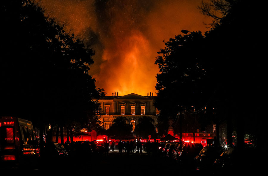Late on September 2, a fire tore through the 200-year-old National Museum of Brazil in Rio de Janeiro, burning for more than five hours and destroying or damaging countless irreplaceable artifacts, fossils, memorabilia, works of art, and more. The museum’s collection reportedly included more than 20 million items. The cause remains under investigation, and salvage efforts are under way, but the losses appear to be enormous. Protesters took to the streets denouncing government mismanagement, neglect, and budget cuts that they say have left the museum and other institutions vulnerable to devastating fires and other disasters. See also Ed Yong’s “What Was Lost in Brazil’s Devastating Museum Fire.”