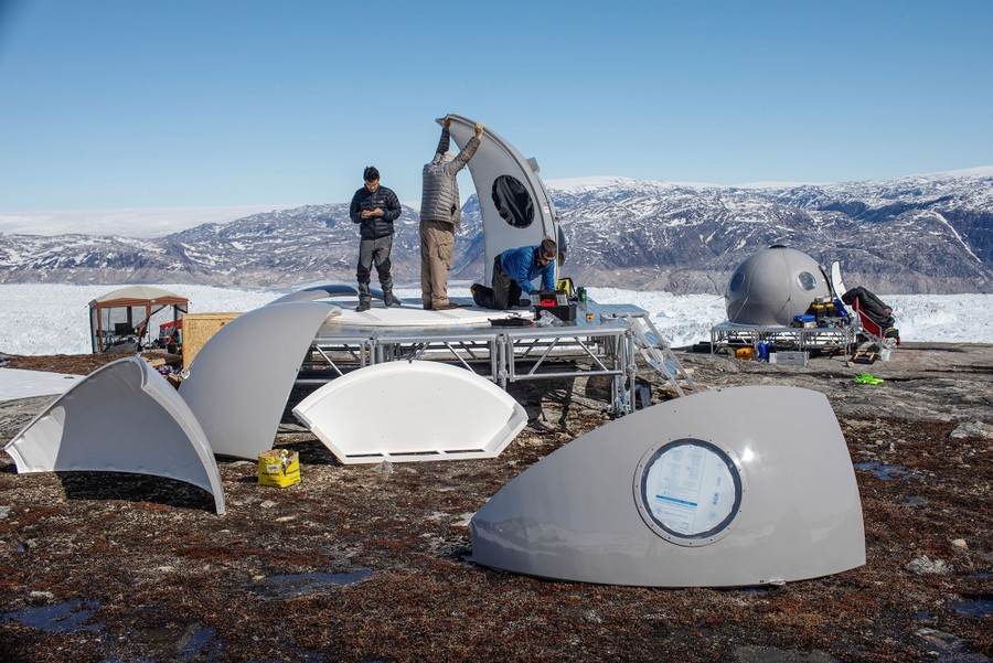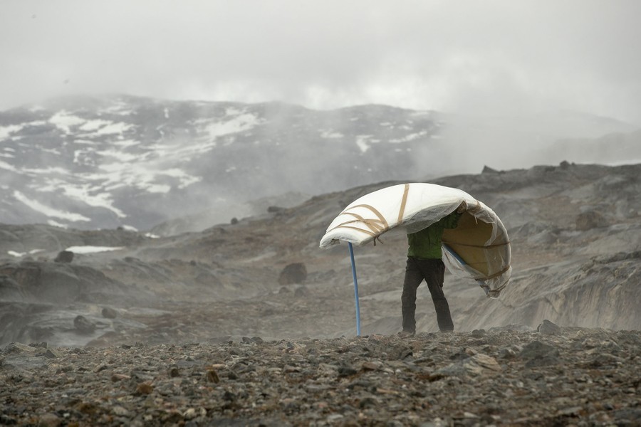 Read moreThe safety officer Brian Rougeux carries a fiberglass shell as he works to assemble a protective radar dome at the research camp above Helheim Glacier near Tasiilaq, Greenland, on June 23, 2018. #