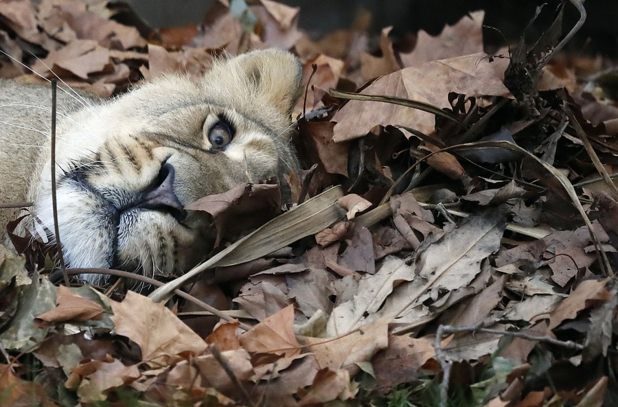 Read moreA lion enjoys pumpkin-spiced treats in a pile of fallen leaves at the zoo in London on October 18, 2018. The lions Heidi, Indi, Rubi, and Bhanu marked the turn of the season by pouncing on a giant pile of colorful leaves, scented with the zoo's special blend of warming spices. #