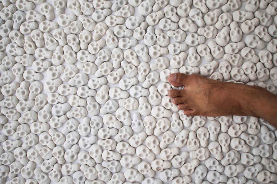 Read moreA man walks on an art installation by the Thai artist Nino Sarabutra titled "What Will We Leave Behind," part of the Bangkok Art Biennale 2018, at the Wat Prayurawongsawas Waraviharn temple in Bangkok on October 19, 2018. #