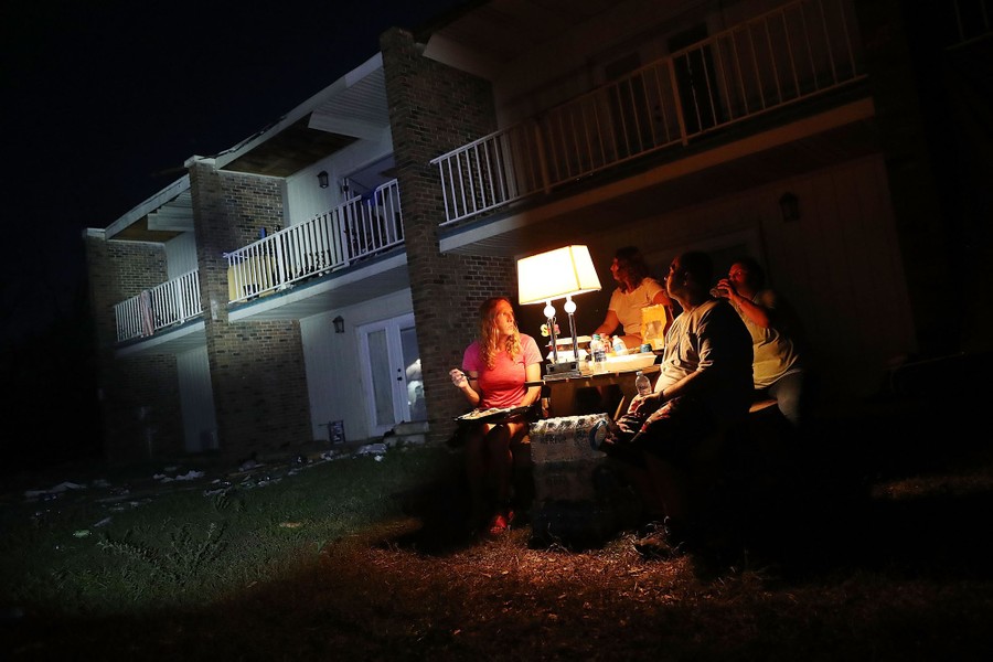 Read moreDanica Cherico and Shawn Gehlert use a generator to power a lamp as they sit outside their apartments that don't have electricity after they were damaged by Hurricane Michael, in Panama City, Florida, on October 15, 2018. #