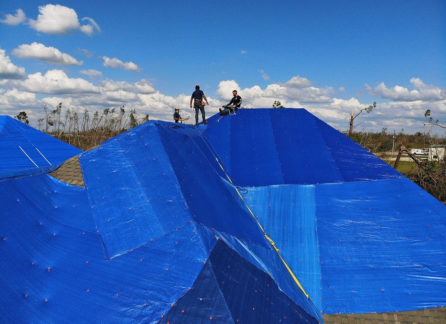 Read moreWorkers from Total Quality Restoration place tarps on a damaged roof as people start the process of rebuilding after Hurricane Michael in Panama City, Florida, on October 16, 2018. #