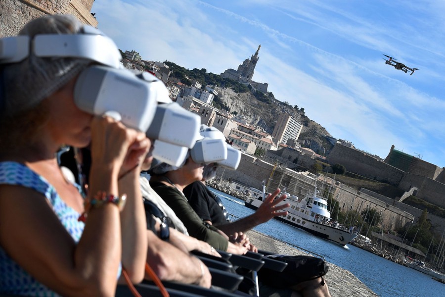 Read moreTourists wear immersive video headsets as they take part in a virtual flight tour of Marseille's Vieux-Port via a drone piloted by a professional pilot, on October 5, 2018. Members of the public can participate in this new tourist attraction called a "drone tour" by sitting in a deck chair facing the sea along the dock. Each person is then given a 3-D video headset to wear, which transmits live stereo images filmed by a drone. #
