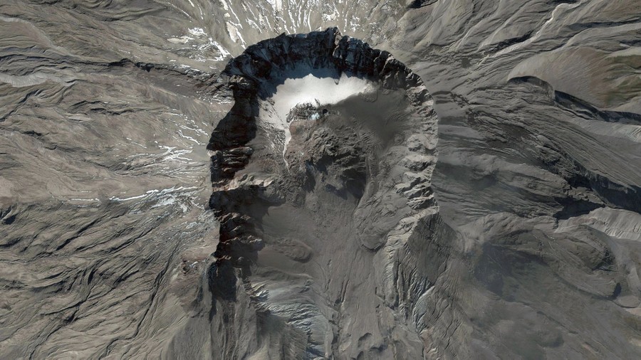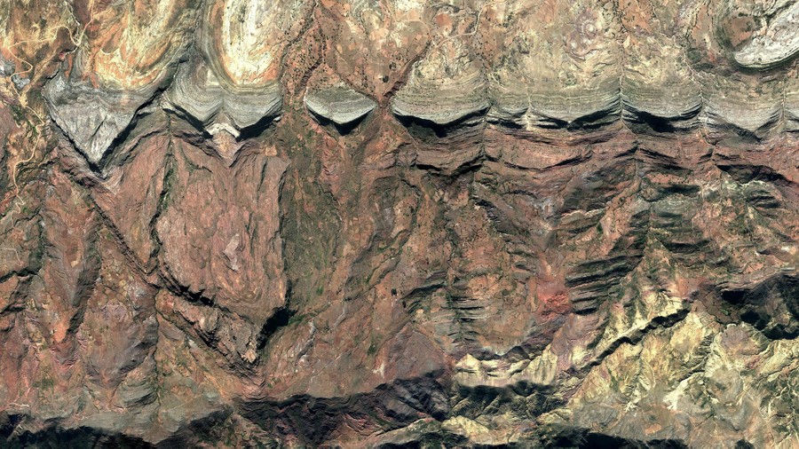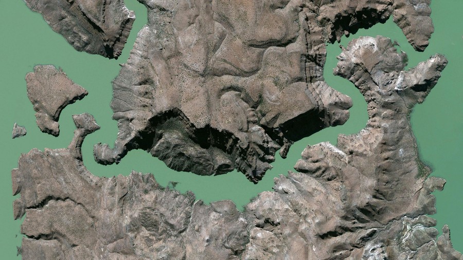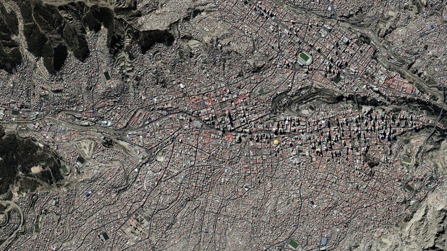 Read moreA seven-square-mile view of mountains and rock formations near the town of Torotoro in the Charcas province of Bolivia. Note the twisting road carved through a pass at far left. See it mapped. #