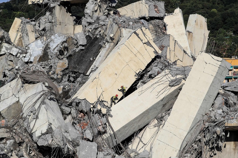 Read moreItalian rescuers climb onto the rubble of the collapsed Morandi motorway bridge searching for victims and survivors in the northern port city of Genoa on August 14, 2018. At least 43 people were killed when the giant bridge collapsed in the deadliest bridge failure in Italy in several years. #