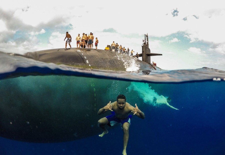 Read more"Steel beach." Sailors dive in to the Pacific Ocean, somewhere near Hawaii, on August 2 during a swim call aboard the Los Angeles–class submarine U.S.S. Olympia after a week-long RIMPAC naval-warfare exercise had just ended. #
