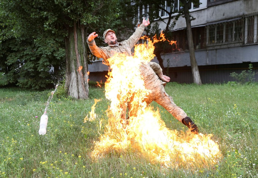 Read moreAn officer on duty (right) attempts to knock down flames as the Ukrainian former serviceman Serhii Ulianov sets himself on fire while protesting against his dismissal from the armed forces in front of the Ukrainian Defense Ministry headquarters in Kiev, Ukraine, on July 26, 2018. #