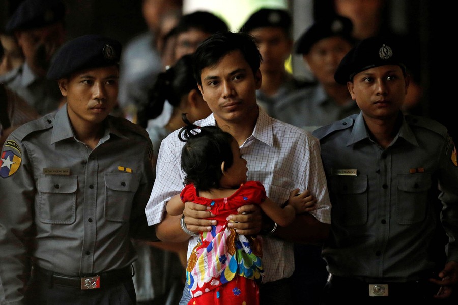Read moreThe Reuters journalist Kyaw Soe Oo, detained and handcuffed, carries his daughter Moe Thin Wai Zin as he arrives for a court hearing in Yangon, Burma (also known as Myanmar), on May 2, 2018. He is one of two Reuters journalists who have been jailed in Myanmar since December 2017 for reporting on attacks against the Rohingya carried out by Buddhist villagers and Myanmar armed forces in Rakhine state. In September, both Kyaw Soe Oo and Wa Lone were found guilty of breaching Myanmar's Official Secrets Act and sentenced to seven years in prison. #