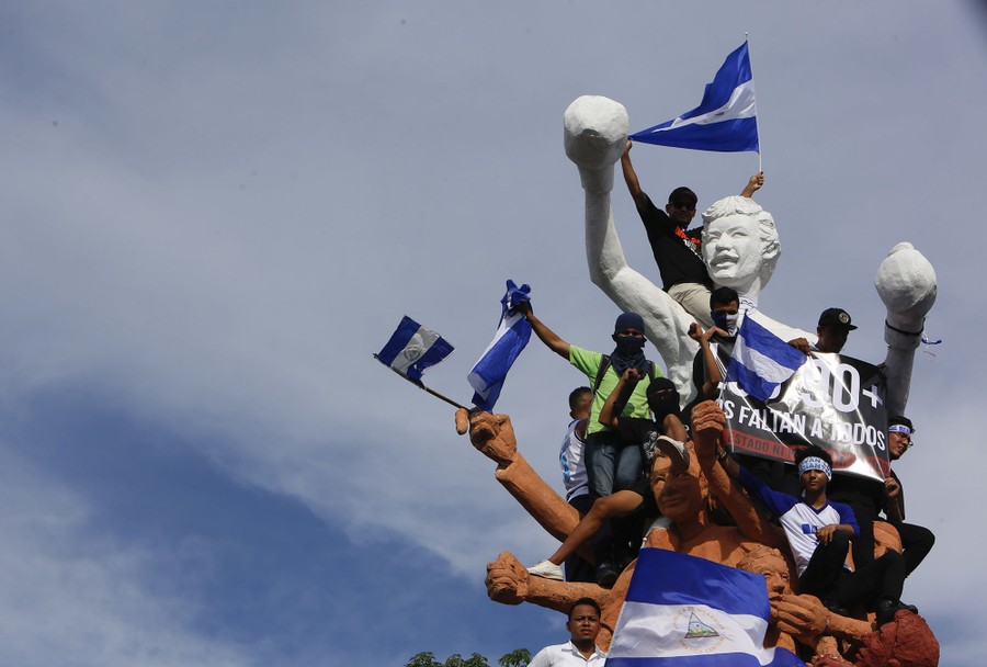 Read moreDemonstrators fly Nicaraguan flags atop the Alexis Arguello monument during a march against Nicaragua's president, Daniel Ortega, in Managua, Nicaragua, on May 30, 2018. #