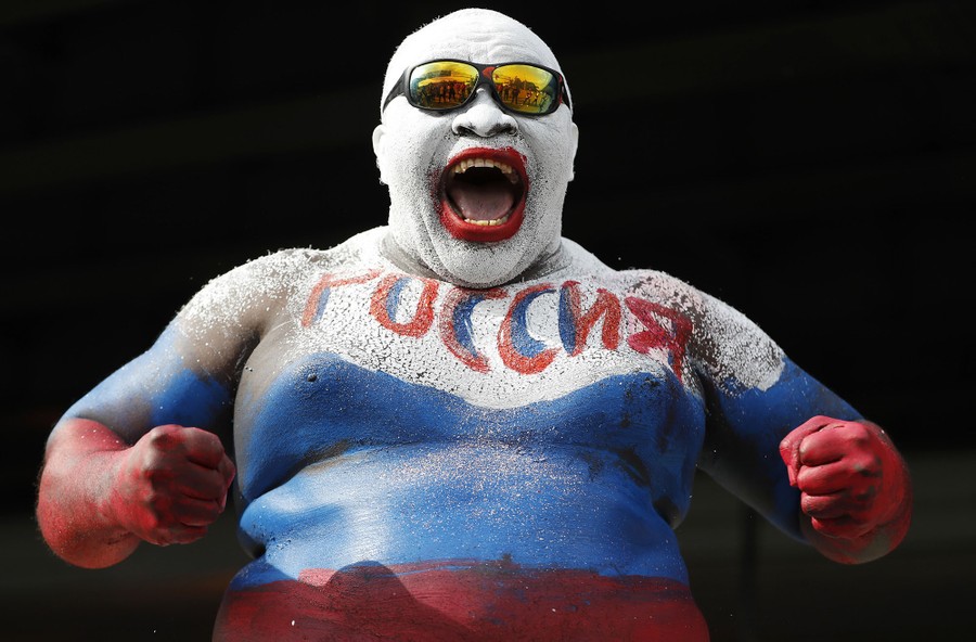 Read moreRigobert Youmbi, from Cameroon, strikes a pose while wearing body paint in the Russian team's colors prior to the 2018 World Cup opening match between Russia and Saudi Arabia at Luzhniki Stadium in Moscow, Russia, on June 14, 2018. #