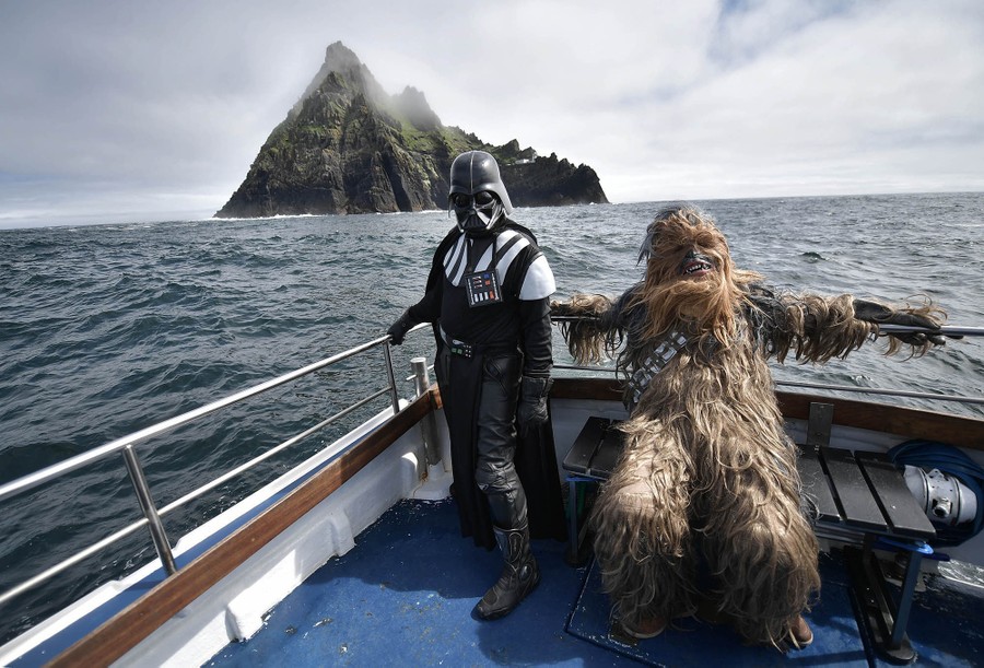 Read moreFans dressed as Darth Vader and Chewbacca take a boat trip to the Skelligs on May 4, 2018, in Portmagee, Ireland. The first Star Wars festival took place against the backdrop of the famous Skellig Michael island, which was used extensively in Episode VII and Episode VIII of the popular science-fiction saga. The small fishing village of Portmagee, which is closest to the location, has seen a boom in tourism following the latest films. #