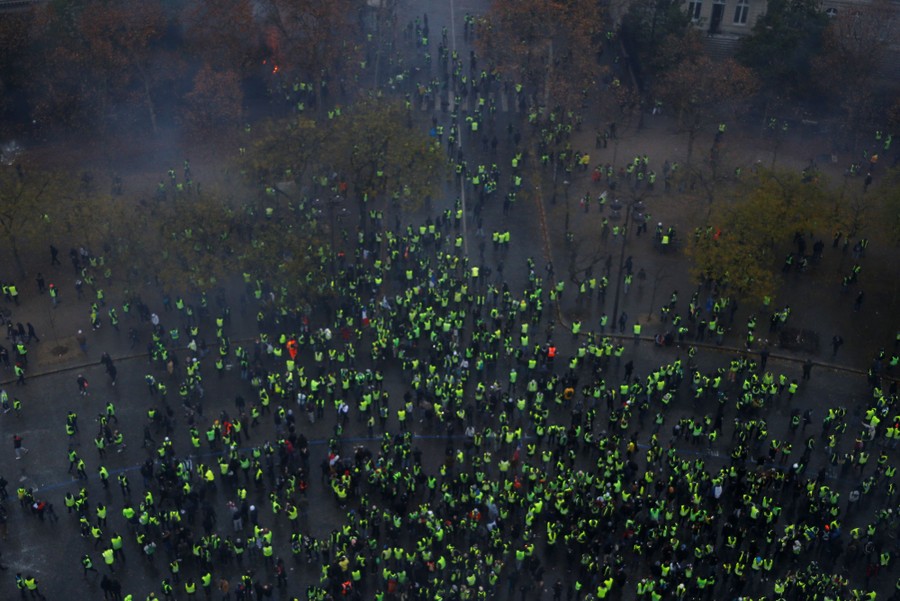 Read moreA view shows protesters wearing yellow vests, a symbol of a French drivers' protest against higher diesel taxes, during clashes at the Place de l'Etoile in Paris on December 1, 2018. #