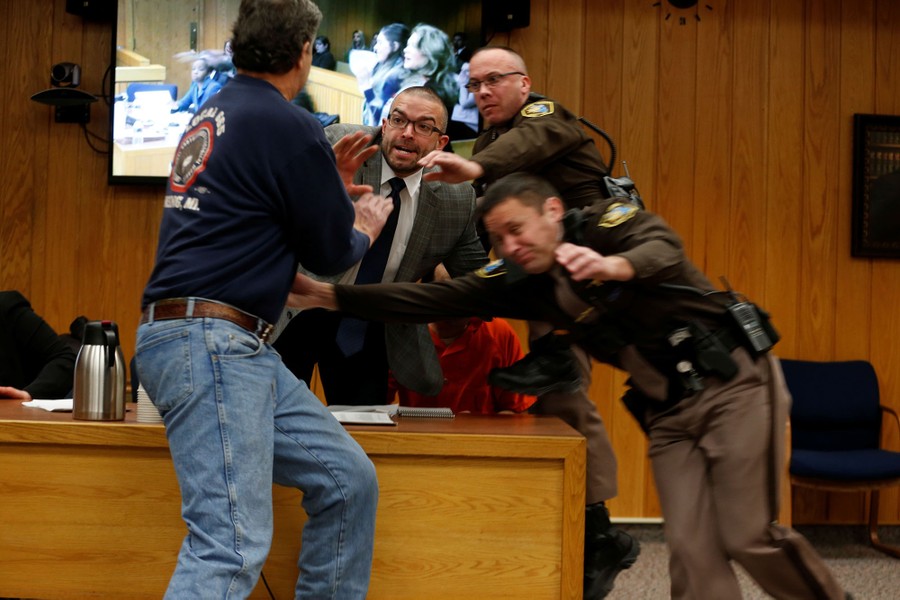 Read moreRandall Margraves (left), the father of three daughters who were abused by Larry Nassar, lunges at Nassar (wearing orange), a former Team USA gymnastics doctor who pleaded guilty in November 2017 to sexual-assault charges, during victim statements of his sentencing in the Eaton County Circuit Court in Charlotte, Michigan, on February 2, 2018. Margraves was restrained, never reaching Nassar. He later apologized to the court, and was released by the judge without punishment "due to the circumstances" of the case. #