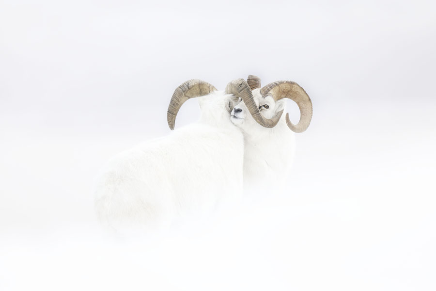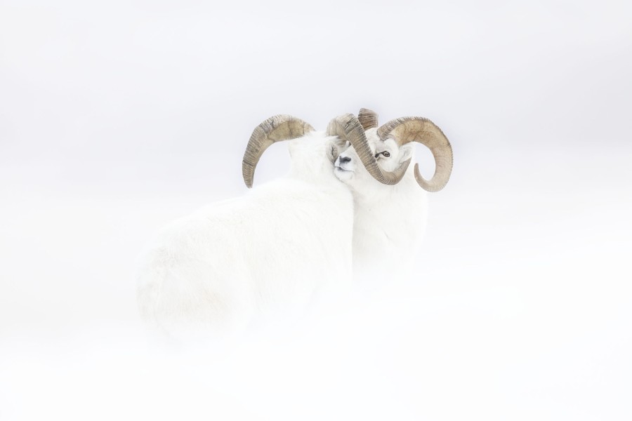 Read moreFrozen Moment. Winner, Rising Star Portfolio Award—Pushing against each other, two male Dall sheep in full winter-white coats stand immobile at the end of a fierce clash on a windswept snowy slope. For years, Villet dreamed of photographing the pure-white North American mountain sheep against snow. Traveling to the Yukon, he rented a van and spent a month following Dall sheep during the rutting season, when mature males compete for mating rights. On a steep ridge, these two rams attempted to duel, but strong winds, a heavy blizzard, and extreme cold (–40 degrees Fahrenheit) forced them into a truce. Lying in the snow, Villet was also battling with the brutal weather—not only were his fingers frozen, but the ferocious wind was making it difficult to hold his lens steady. So determined was he to create the photograph he had in mind that he continued firing off frames, unaware that his feet were succumbing to frostbite, which would take months to recover from. He had just one sharp image, but that was also the vision of his dreams—the horns and key facial features of the mountain sheep etched into the white canvas, their fur blending into the snowscape. #