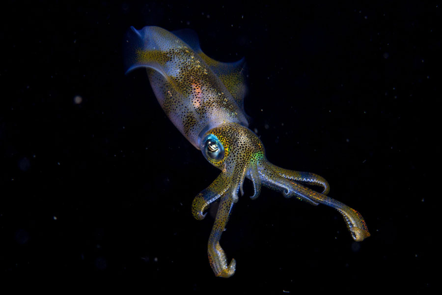 Read moreNight Glow. Winner, 11–14 Years Old—Cruz was on an organized night dive in the Lembeh Strait off North Sulawesi, Indonesia, and as an eager photographer and speedy swimmer, was asked to hold back from the main group to allow slower swimmers a chance of photography. This was how he found himself over an unpromising sand flat, in just three meters of water. It was here where he encountered a pair of bigfin reef squid. They were engaged in courtship, involving a glowing, fast-changing communication of lines, spots, and stripes of varying shades and colors. One immediately jetted away, but the other—probably the male—hovered just long enough for Cruz to capture one instant of its glowing underwater show. #