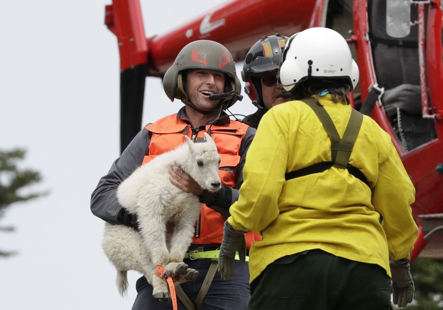 Read moreDerrick Halsey, a wildlife-capture specialist known as a "mugger," hands off a kid mountain goat to the Olympic National Park Wildlife Branch chief Patti Happe on July 9, 2019, after airlifting the goat and two others to Hurricane Ridge in the park near Port Angeles, Washington. For the second straight summer, officials are rounding up the sure-footed but non-native mammals from remote, rugged parts of the park so they can be relocated to their natural habitat in the Cascade Mountains. The animals were introduced to the Olympic Peninsula by hunters in the 1920s. #