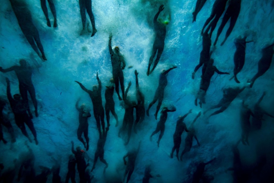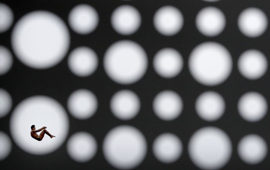 Read moreViacheslav Kolesnikov of Ukraine dives, as seen through a wall filled with holes, during the men's high-diving competition at the World Aquatics Championships in Gwangju, South Korea, on July 24, 2019. #