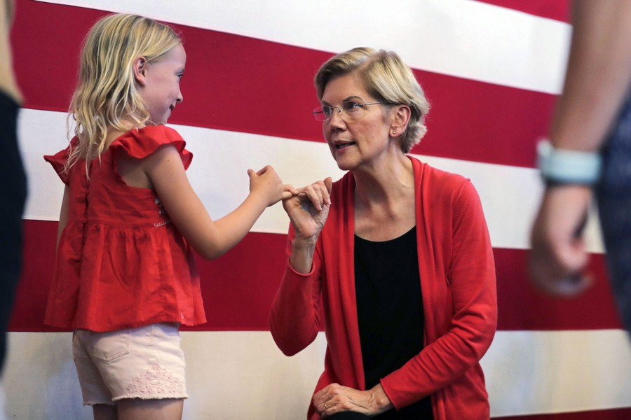 Read moreDemocratic presidential candidate Senator Elizabeth Warren makes a pinky promise as she chats with Sydney Hansen, 8, of Oakland, California, during a campaign stop at a town hall in Peterborough, New Hampshire, on July 8, 2019. #
