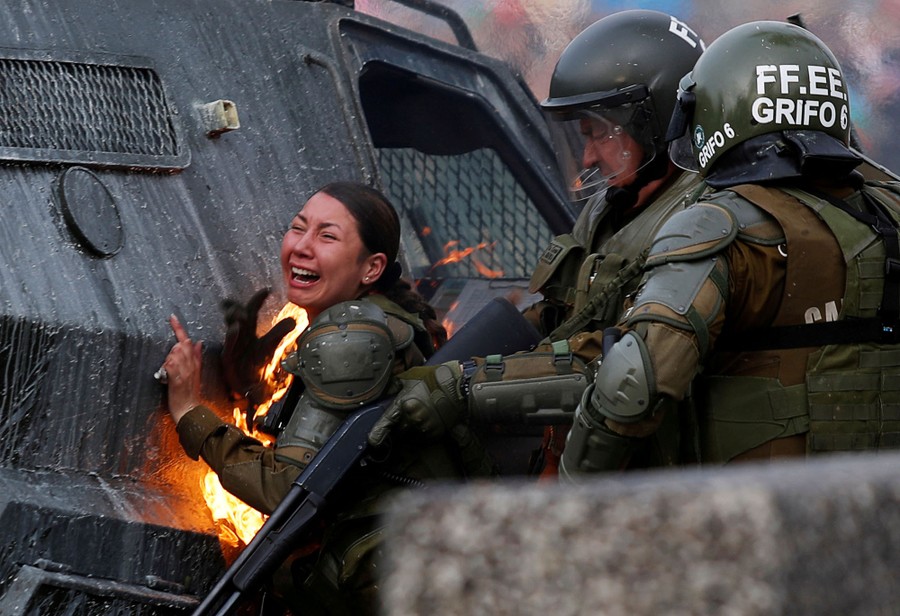Read moreA riot-police officer reacts after a Molotov cocktail landed nearby, splashing fire onto several officers during a protest against Chile's government in Santiago, Chile, on November 4, 2019. #