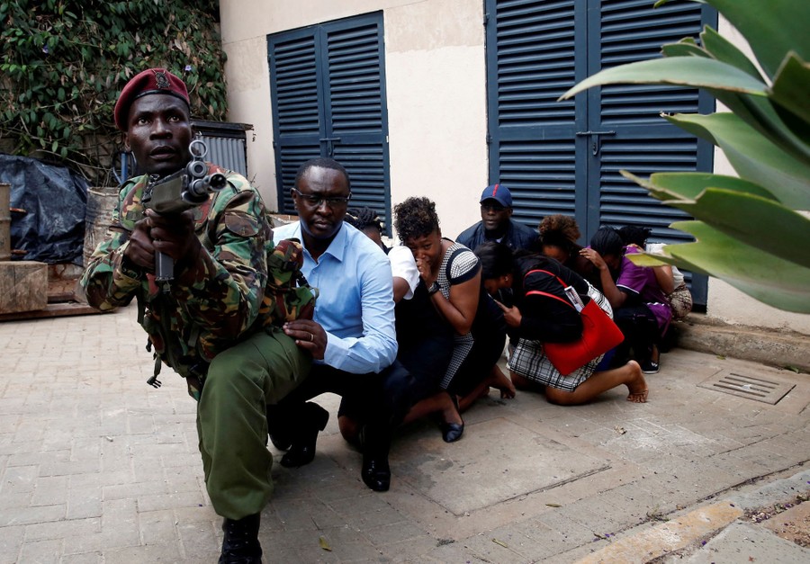 Read morePeople are evacuated by a member of security forces at the scene of a terror attack at the Dusit Hotel compound in Nairobi, Kenya, on January 15, 2019. The attack, carried out by members of the jihadist militant group Al-Shabaab, left 21 civilians dead. #