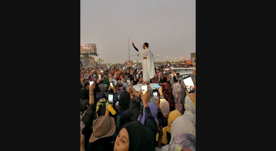 Read moreAlaa Salah, 22, stands on a car leading chants during a protest demanding that Sudanese President Omar al-Bashir step down, in Khartoum, Sudan, on April 8, 2019, in this still image taken from a social-media video obtained on April 9. Months of demonstrations and civil disobedience led up to the Sudanese Armed Forces staging a coup on April 11, removing the dictator Bashir from power after 30 years. #