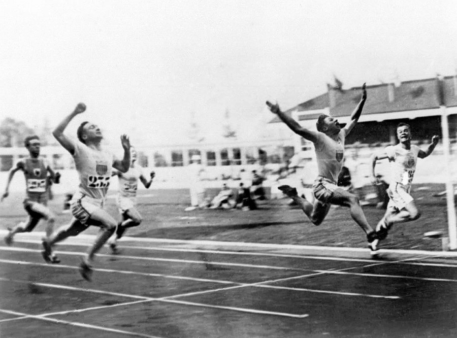 Read moreOriginal caption: "Charles (Charley) Paddock, second from right, of the U.S.A. wins the 100 meters final with his famous 'flying finish' at the 1920 Summer Olympics in Antwerp, Belgium. Morris Kirksey, far right, of the U.S.A. was second, and Jackson Scholz of U.S.A., left, was fourth." #