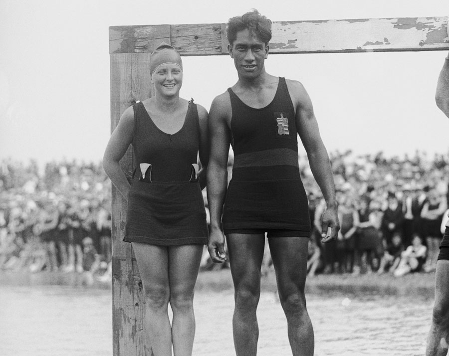 Read moreSwimmers from Team U.S.A. photographed at the 1920 Olympics in Antwerp on July 25, 1920. At left is Ethelda Bleibtrey from New York, who won three gold medals at the competition, and at right is Hawaii's Duke Kahanamoku, who took home two gold medals. #