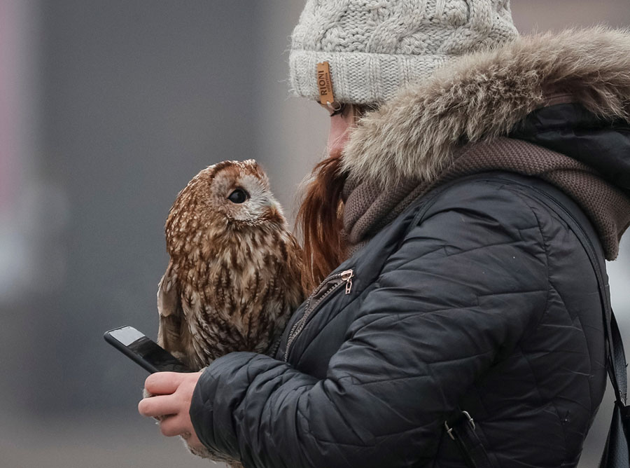 Read moreA woman with an owl, which poses for pictures with tourists, uses her cellphone as they wait for clients in central Kyiv, Ukraine. #