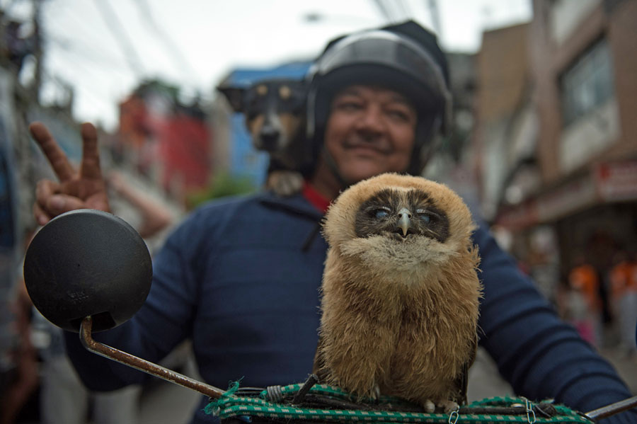Read moreA man flashes the "V" sign as he drives a motorcycle with his owl and dog in Rio's Rocinha favela in Brazil. #