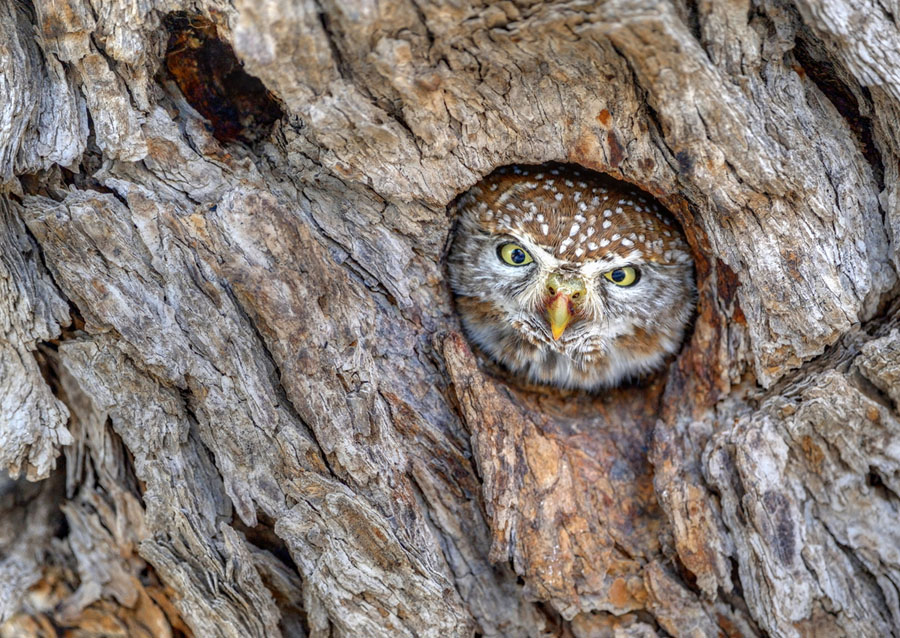Read moreA pearl-spotted owlet peers out of a hole in a tree. #